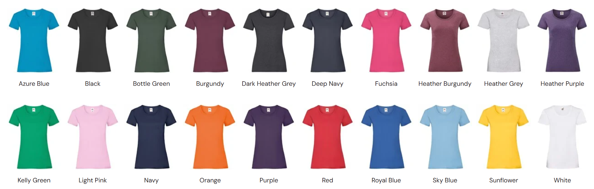 - White and Heather Grey: 140gsm, Medium colours: 145gsm, Dark colours 150gsm